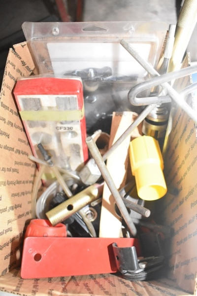 Box lot of tools including Mighty Vac, oil filter wrench