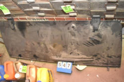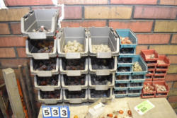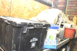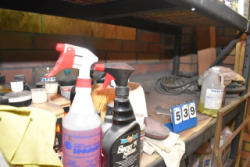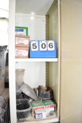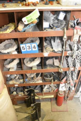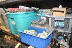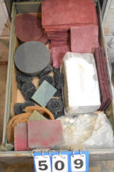 Bin organizer with contents consisting of buffing pads, pipe cutters, chain pieces, etc.