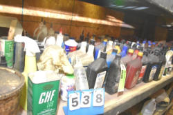 Shelf lot of assorted fluids including oil, gear & axle lubricant, power steering fluid, etc.