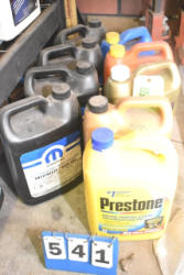 Shelf lot of assorted automotive fluids including hydraulic jack fluid, ATF, etc.