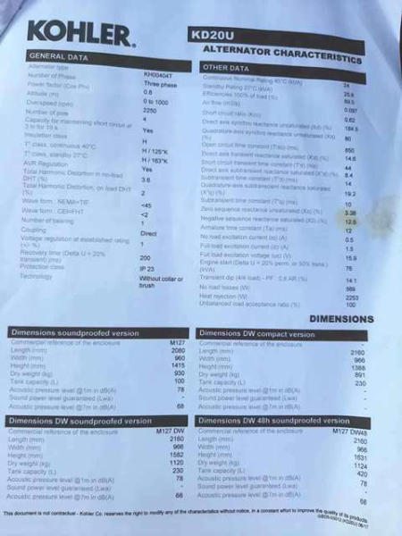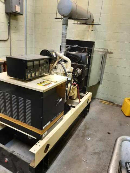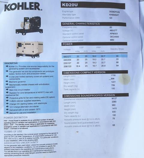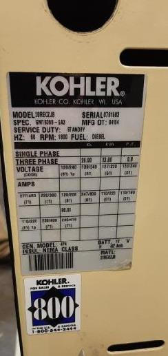 2004 Kohler generator, diesel, Model: 29RE02JB, 20 KVA. New battery in 2018. John Deere Powertech 209 liter engine, SN: 0731583. 588 +/- hours. Runs and operates.