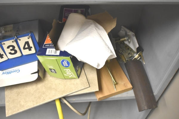 Under counter contents consisting of cleaning supplies, hats, small trash bags, etc.