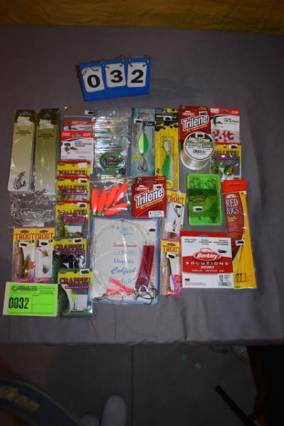 (4) fishing line assortment, (3) #8 hooks, (4) #1 hooks, (5) #6 hooks, (4) walleye lures, (4) trout lures, (2) crappie lures, dbl codfish, catfish hooks, (6) split shot, #7 hooks, (2) sinkers, (2) bobbers, (2) assorted lures