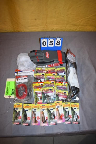 Berkley gloves, (3) sm nets, boat rod holder, (2) stringer, (21) assorted