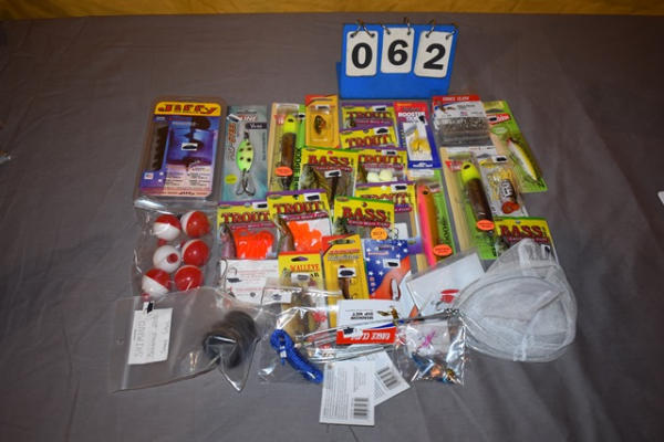 (4) sm nets, shimano spool, stringer, bobbers, (3) jigs, replacement blades, (23) assorted lures