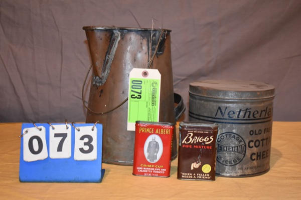 Water pot, tobacco cans, cottage cheese can