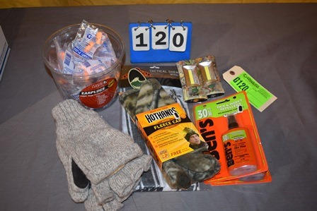 hothands cap, wool gloves, bucket of ear plugs, (2) tick spray, (2) camo flashlights, tactical shemagh