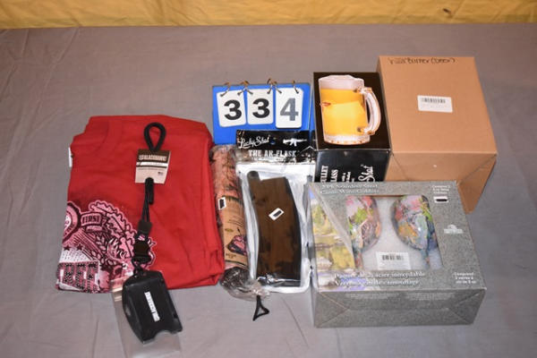 (2) youth shirts, lanyard, wine goblets , beer mug, wax burner , AR flask, umbrella