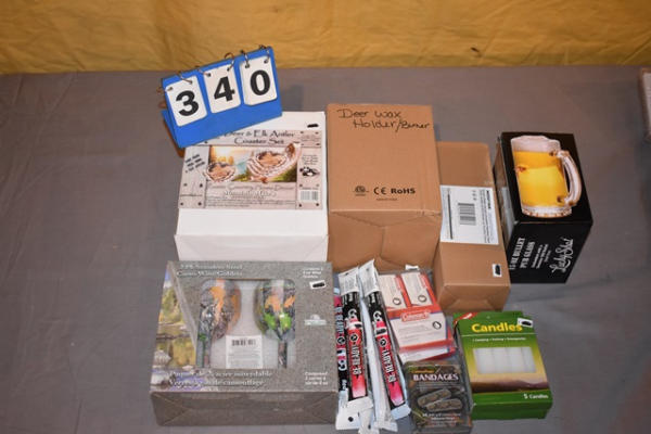 Wine goblets, wax burner, water bottle, beer mug, coaster set, (5) safety sticks, (2) candles, (2) matches pks, (1) bandaid kit
