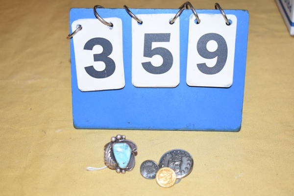 Turquoise feather ring, (3) various pins