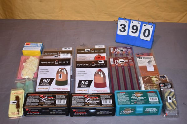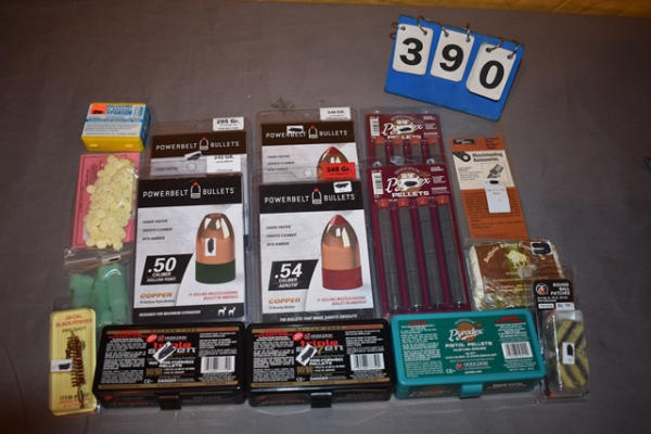 (4) powerbelt bullets, (5) hodgdon pellet assorted, (7) black powder assortment accessories
