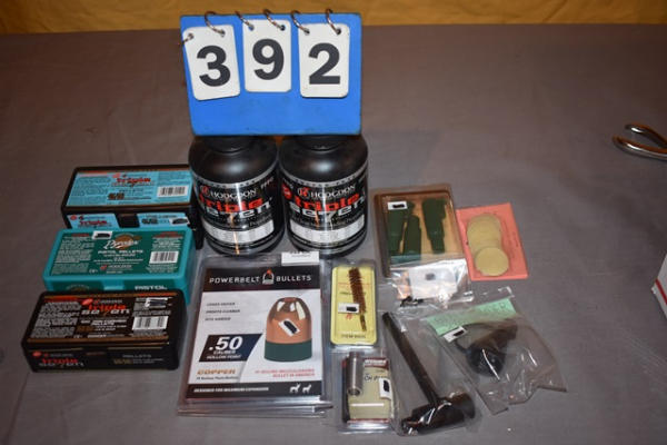 (3) various pellets, (2) powerbelt bullets, (2) assorted loose powders, (7) assorted black powder items