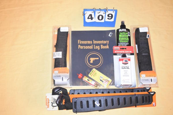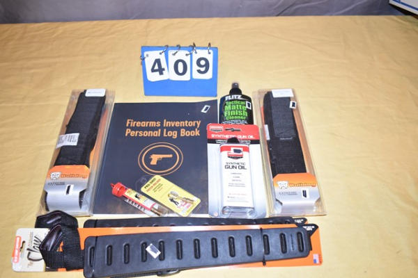 Rifle & shotgun ammo belt, (2) slings, gun oil, gun log book, tactical finish cleaner, (2) gun cleaning tools
