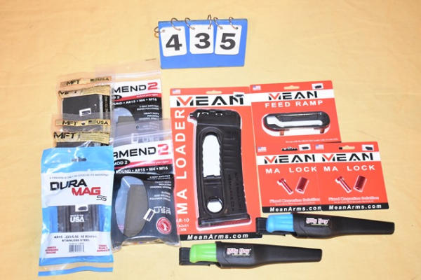MA Loader, MA feed ramp, (2) MA lock, (4) poly AR 15 10rd mags, Steel AR15 mag, (2) knives