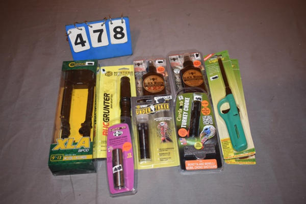 Bipod, deer call, (3) various chokes, (2) lighters, (2) deer lures