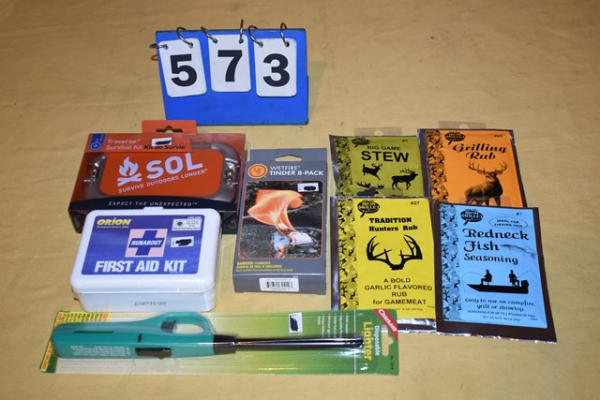(4) various rubs, lighter, survival kit, first aid kit, tinder 8pk