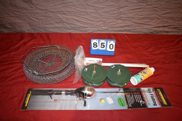 Ice fishing pole, 2 plastic reels, fish cage, 2 ice skimmers, powerbait