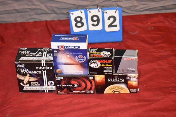 Fiocchi 16 ga 8 shot 25rds, (2) 300BLK 220gr 20rds federal, .338 lapua 10 rds , federal 12 ga rifled slug, wolf 7.62x39 20rds , federal 25 auto FMJ 25rds