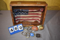 shadow box w/american flag, assorted belt buckle