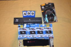 Bat light, (2) locks, (4) slingshot ammo, 4" knife, door jam alarm, (2) drink test kits