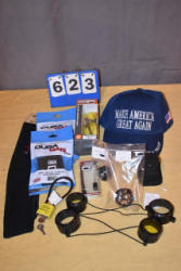 Trump hat, safety glasses, s&w 29 speedloader, (3) assorted scope covers, (2) AR 15 mags, Speed loader pouch, lock