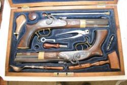 Ornate .45 caliber black powder dueling pistol set. Made in Spain with accessories and ornate case. S/NS: 8711,8707