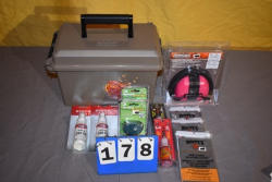 (3) gun cloths, (2) gun oil, (2) locks, ammo can, pink earmuffs, (2) gun lube