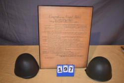 "Congrefs of the US wooden poster"; (2) army helmets