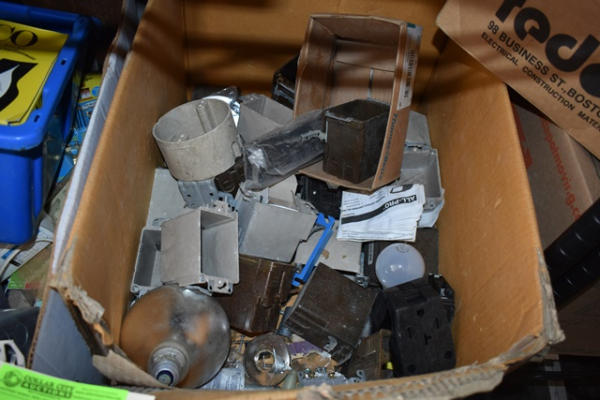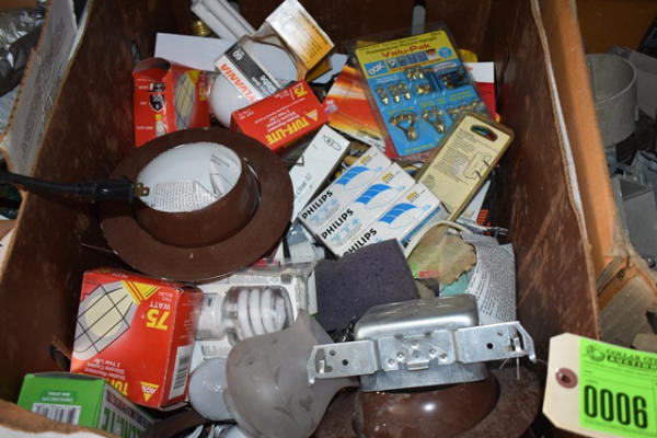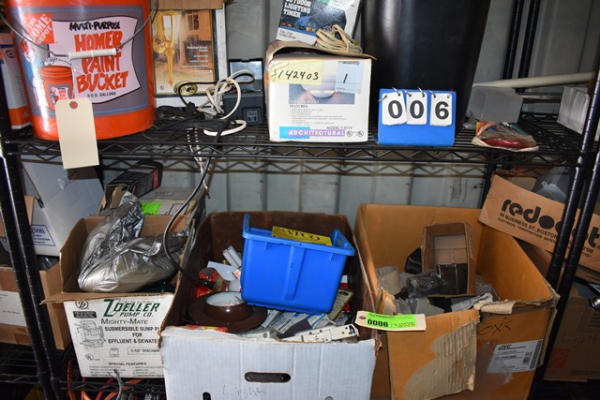 Double shelf lot including various light bulbs, light fixtures, 2 sump pumps, electrical boxes, etc.