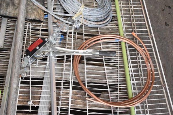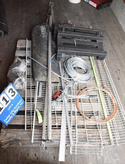 Lot includes a Come-a-long, steel cable, wire shelving, etc.
