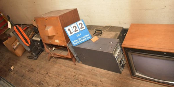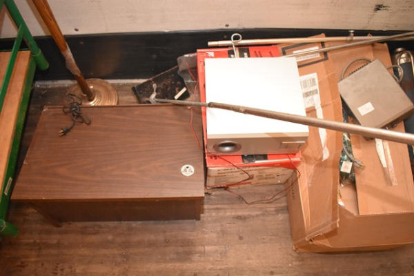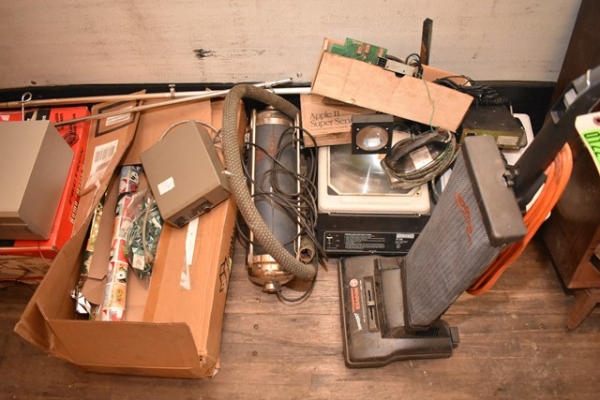 Large lot of vintage electronics including televisions, vintage vacuums, surround sound system, podium, projectors, etc.