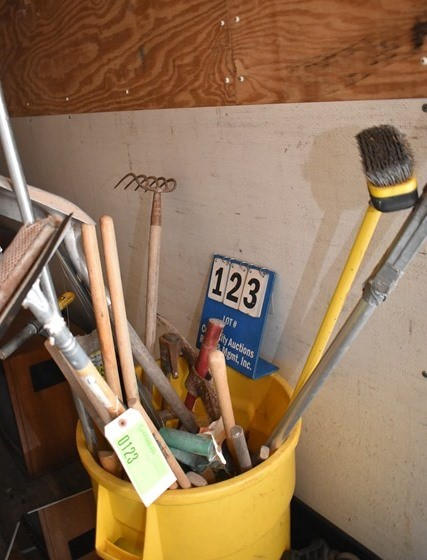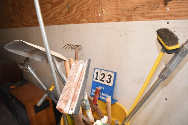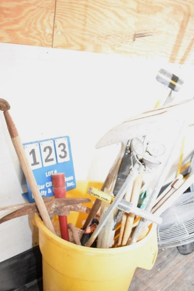Lot of outdoor hand tools including rake, shovel, pick axes, etc.