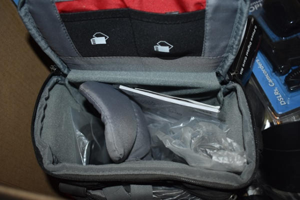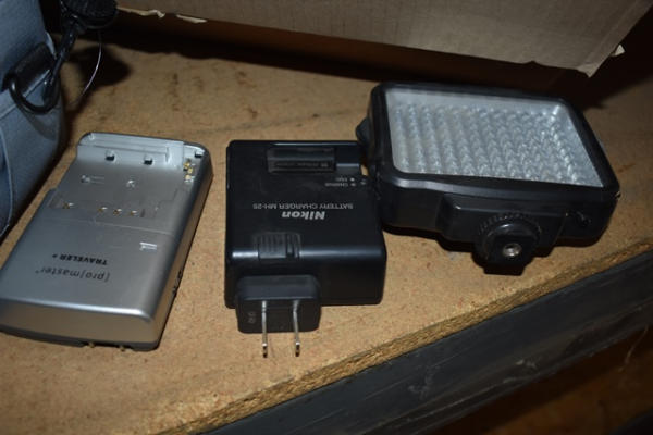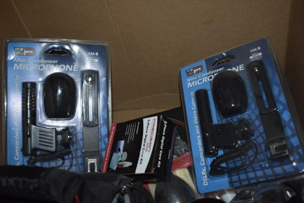 Lot includes an Eddy Bauer small camera bag, mini condenser microphones, battery chargers, camera flash system, camera cleaning system, camera bag, etc.