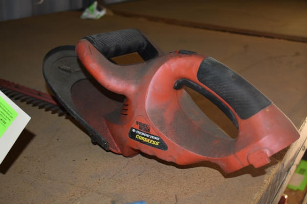 Lot includes a Ryobi 18" electric chainsaw and a Hedge Hog Cordless Black & Decker hedge trimmer