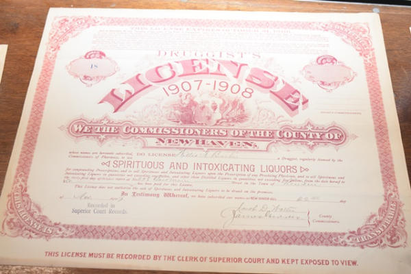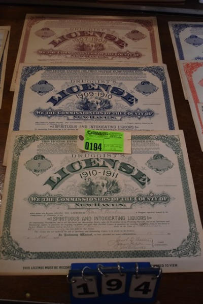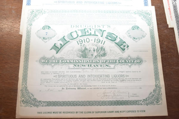 Lot of 1907 - 1908, 1909 - 1910, 1910 - 1911 New Haven Druggist's Licenses