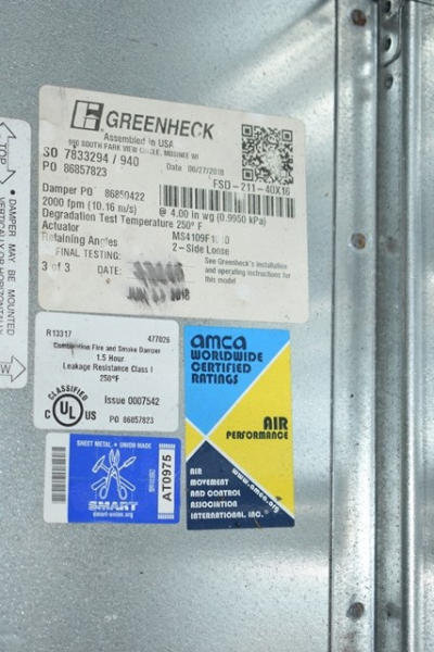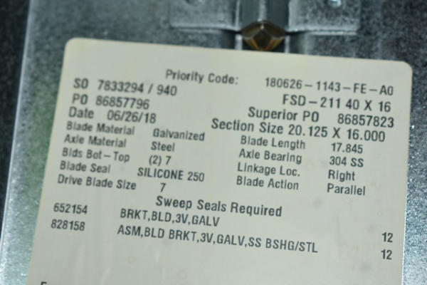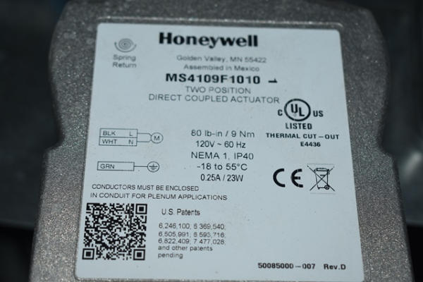Damper assembly, 40" x 16" with a Honeywell 2-position direct cup bolt actuator on it