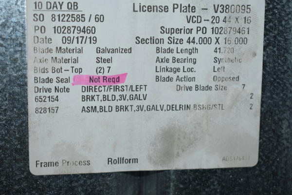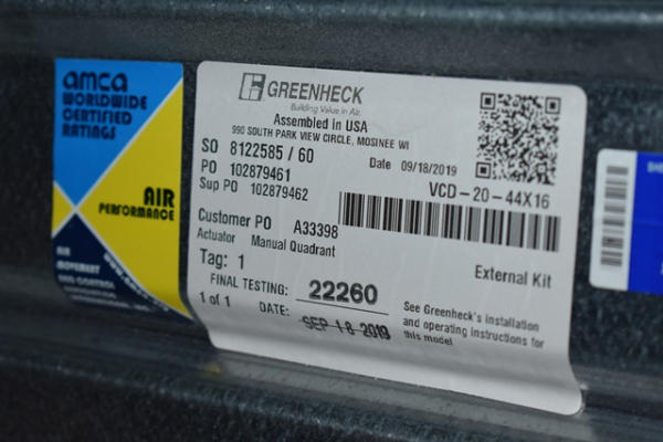 Volume damper, 44" x 16"