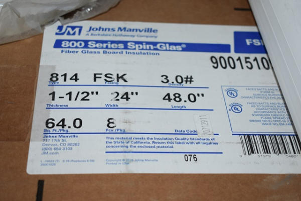 Box of John Manville fiberglass insulation board, 1 1/2" thick x 24" wide x 48" tall