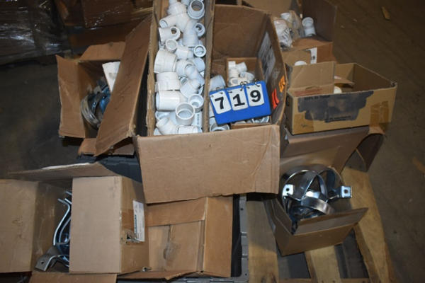 Pallet of mostly CPVC fittings, metal bracketry, metal pipe hangers