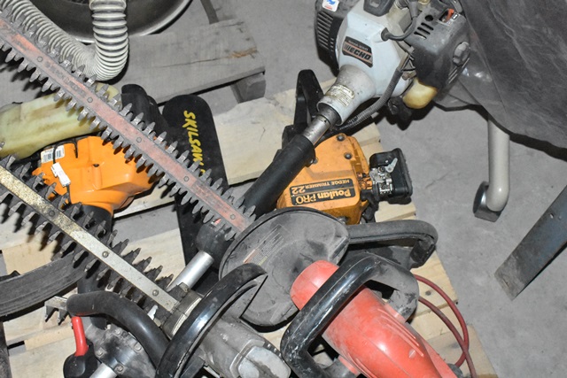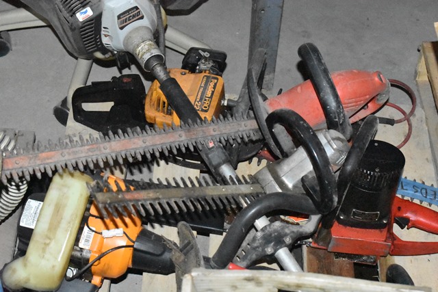 Pallet Lot of Small Engine Weed Wackers, Electric Hedge Trimmers, Chairs, Etc.