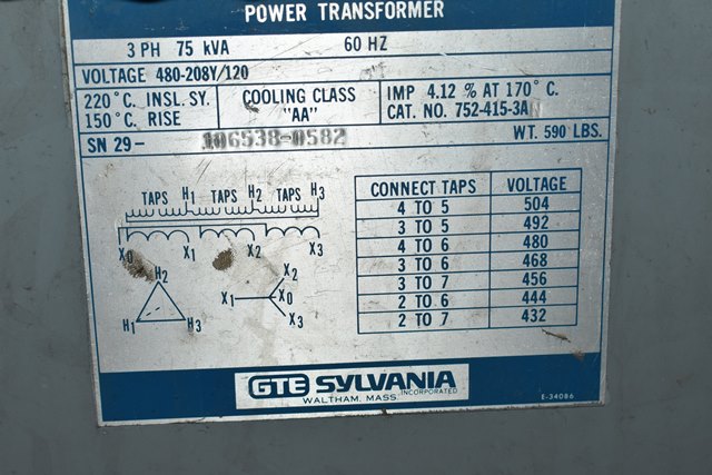 Sylvania Power Transfer Transformer. 3 Phase , 75KVA, 480/208/120 Voltage