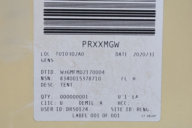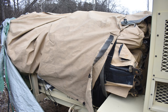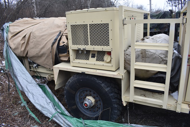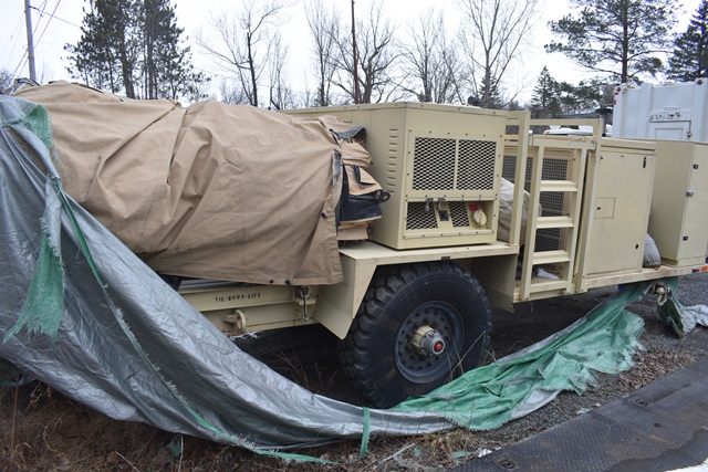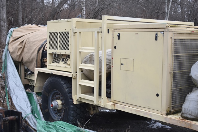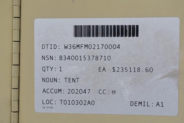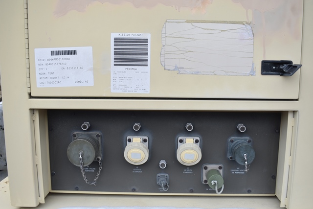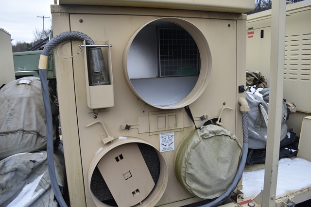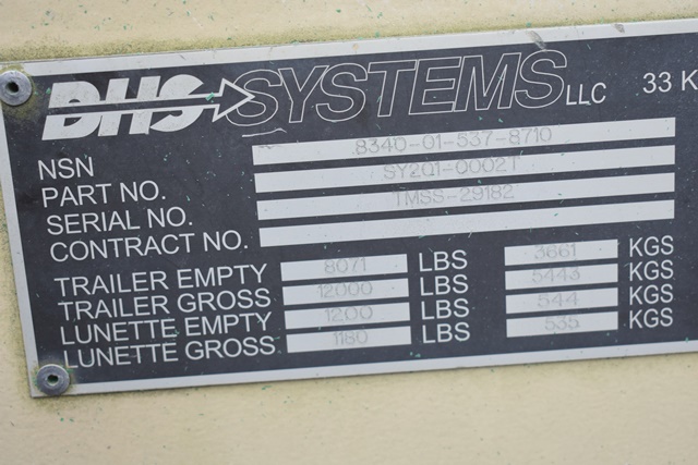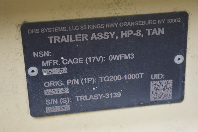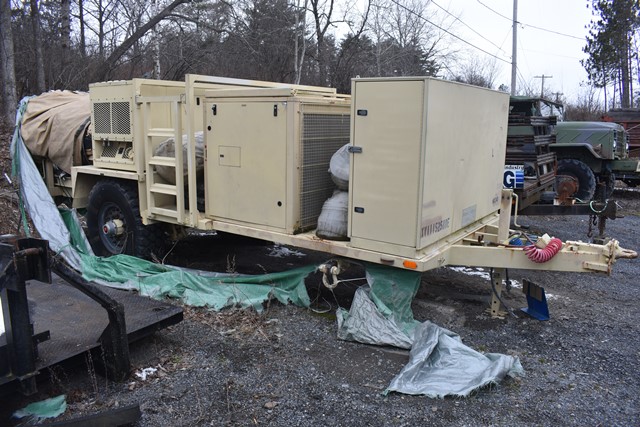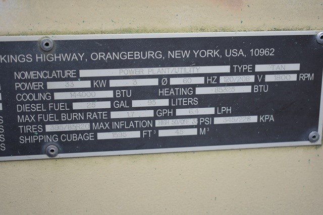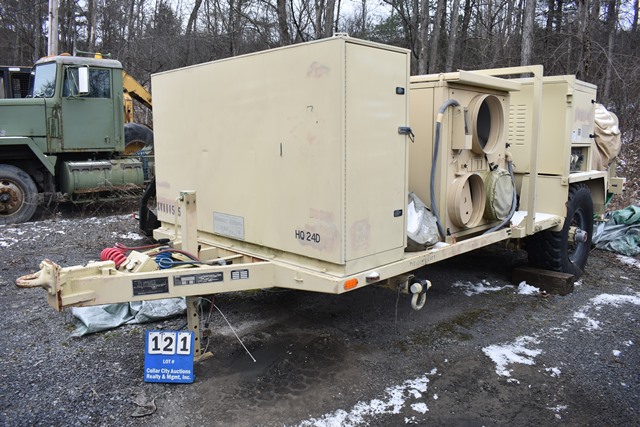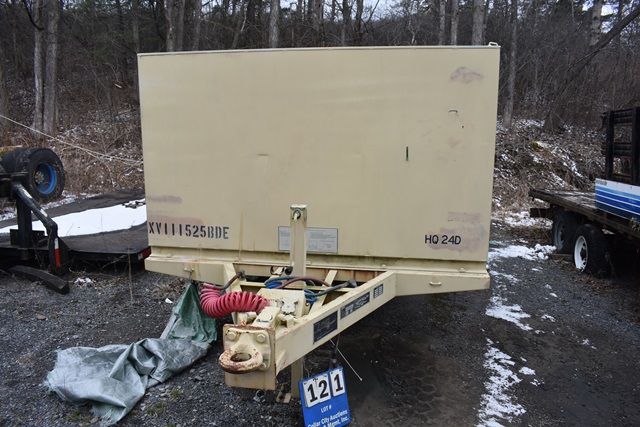 #121 – DHS Systems LLC, Drash Military Tent System. Serial No. TMSS-2918. GenSet with Enclosure. Power Plant/Utility Trailer, 33Kw Generator, 60Hz,120/208V, 25 Gallon Diesel Fuel Tank, Max. Fuel Burn Rate of 1.7 GPH. 395/85R20 Tires, 144,000BTU A/C Unit , 85,325BTU Heating Unit. Gross Weight 12,000lbs. NSN # 8340-01-537-8710. Panel Hook Mount, Air Brakes. Located at 1027 Leesome Lane, Altamont, NY 12009.