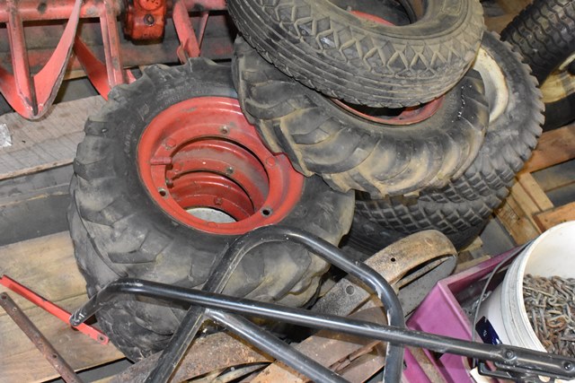 Pallet Including Gravely Parts, Gravely Wheels, Chains, Etc.